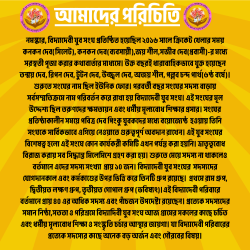 আমাদের বিদ্যাদেবী যুব সংঘ পরিবার। দিনটি ছিল ২০২৪ সালের সিলেট শহরের ঢাকা দক্ষিণ মন্দিরে। আমাদের সংঘে বিশেষত্ব কি জানেন? আমাদের সংঘে কোন কার্যকরী কমিটি নেই, ভ্রাতৃত্ববোধ বিরাজ করায় সবাই মিলে আমরা সিদ্ধান্ত গ্রহণ নেই।